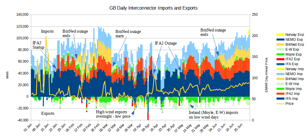 I have put together a chart from BM Reports half hourly data on interconnector flows showing the daily imports and exports on each interconnector over the first half of the year. If an interconnector handles exports part of the day and imports for another part, both flows are shown and not the net position. Typically, Ireland, which has a high wind dependence, imports during higher demand hours and on low wind days and exports to the UK when it is windy, while exports to the continent tend to be on windy days and overnight when demand is low and half hourly prices can even turn negative.