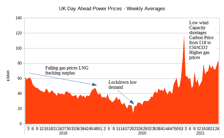 Correct. What is particularly worrying is that we have been seeing very high wholesale prices in recent weeks at a time of year when demand is lower and we have the boost of some solar output. It’s due to a combination vof factors. Carbon prices have soared to around £50/tonne CO2, way above the £18/tonne CO2 that applied last year as a floor price. A year ago, wholesale NBP gas prices were as low as 12p/therm, or 0.4p/kWh on the back of very low demand caused by lockdowns. They surged in the Spring to 75p/kWh, or about 2.5p/kWh (£25/MWh), and are hovering at about 50p/therm currently. A simple rule of thumb is that electricity generated from gas costs twice the gas price before green taxes.