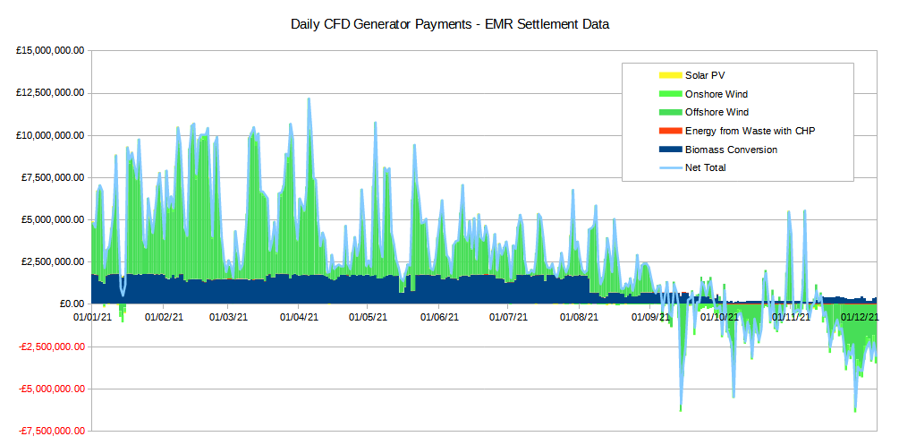 Of course, current electricity prices are above that average, and it has has just been announced that suppliers will share a £39m payment in respect of the last quarter in consequence. The daily payments to/from CFD generators over the last year are shown in this chart