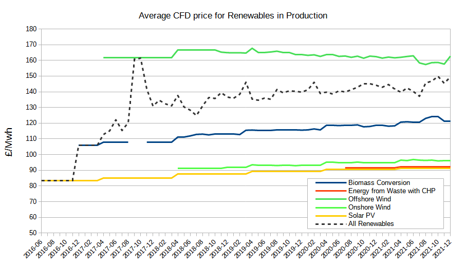 The current value of the Hinkley Point CFD is £106.12/MWh. My ready reckoner tells me that Rolls Royce’s projected costing of £1.8bn for a 470MWe SMR with a 60 year life works out at around £35/MWh for the capital cost element at a 7% financing rate, so £40/MWh after allowing £5/MWh for fuel and maintenance, assuming a 90% utilisation. However that is before the ONR has managed to saddle it with a load of unnecessary cost. A comparison with the Barakah project in the UAE, which supposedly cost $25bn for 4 reactors totalling 5.6GW shows similar levels of cost for current proven technology, although there may be some undisclosed cost overrun there – but there is no reason to be paying EPR prices for nuclear if we proceed sensibly. It is interesting to compare with the CFDs in payment for our existing wind, solar and biomass: this chart shows average strike prices weighted by energy generated using data from EMR Settlements, with the overall average now being just under £150/MWh