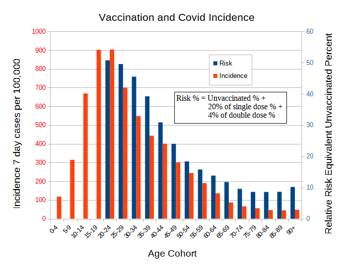 Current case incidence and effective risk from degree of vaccination by age cohort (using Delta variant estimated vaccine effectiveness) – demonstrates a strong link