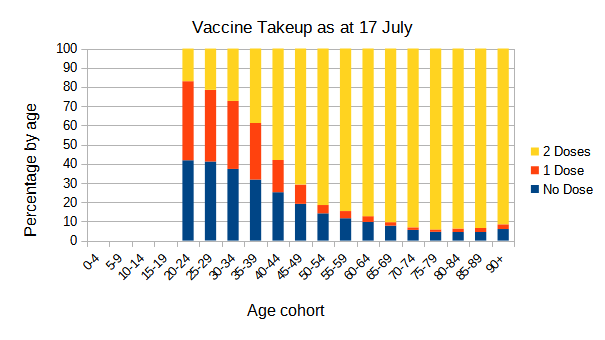 Looking at the statistics it is clear that the vaccines work to reduce deaths very substantially (to the point where they barely show up on a chart that incorporates last winter – about 1 in 2,000 cases, as against about 1 in 50), and hospitalisations very significantly (cases in the winter were almost 4 times as likely to go to hospital), while also reducing transmission risk. The track and trace system does not seem to work at all, in line with what we should expect given its modus operandi: it should be abandoned, and with it all the isolation that is enforced long after the horse has bolted, and largely pointlessly among the already vaccinated and previous cases with built up immunity. It seems quite likely that we have a spike related to exuberant support for the football that may well subside in coming days. New cases are dominated by those under 30, who also are the least vaccinated.