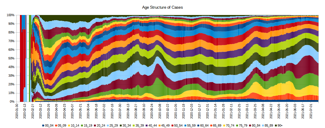 Case numbers as measured by positive tests by age cohort (N.B. it is likely that the original epidemic was under-measured because of insufficient testing)