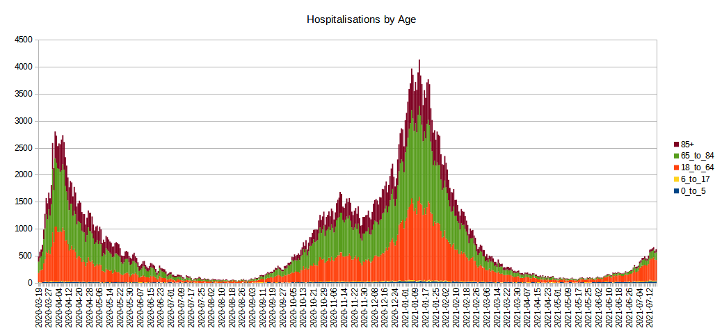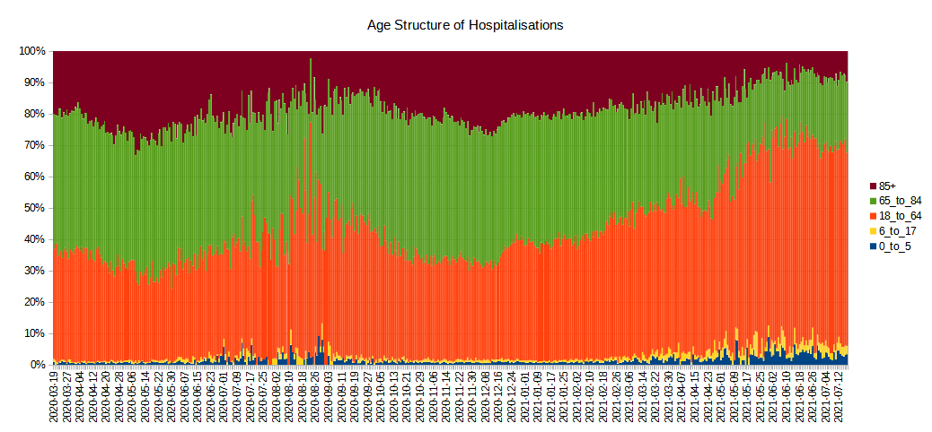 Proportions of hospitalisations by broad age groups (note the decline in over 65s as the vaccine kicks in)